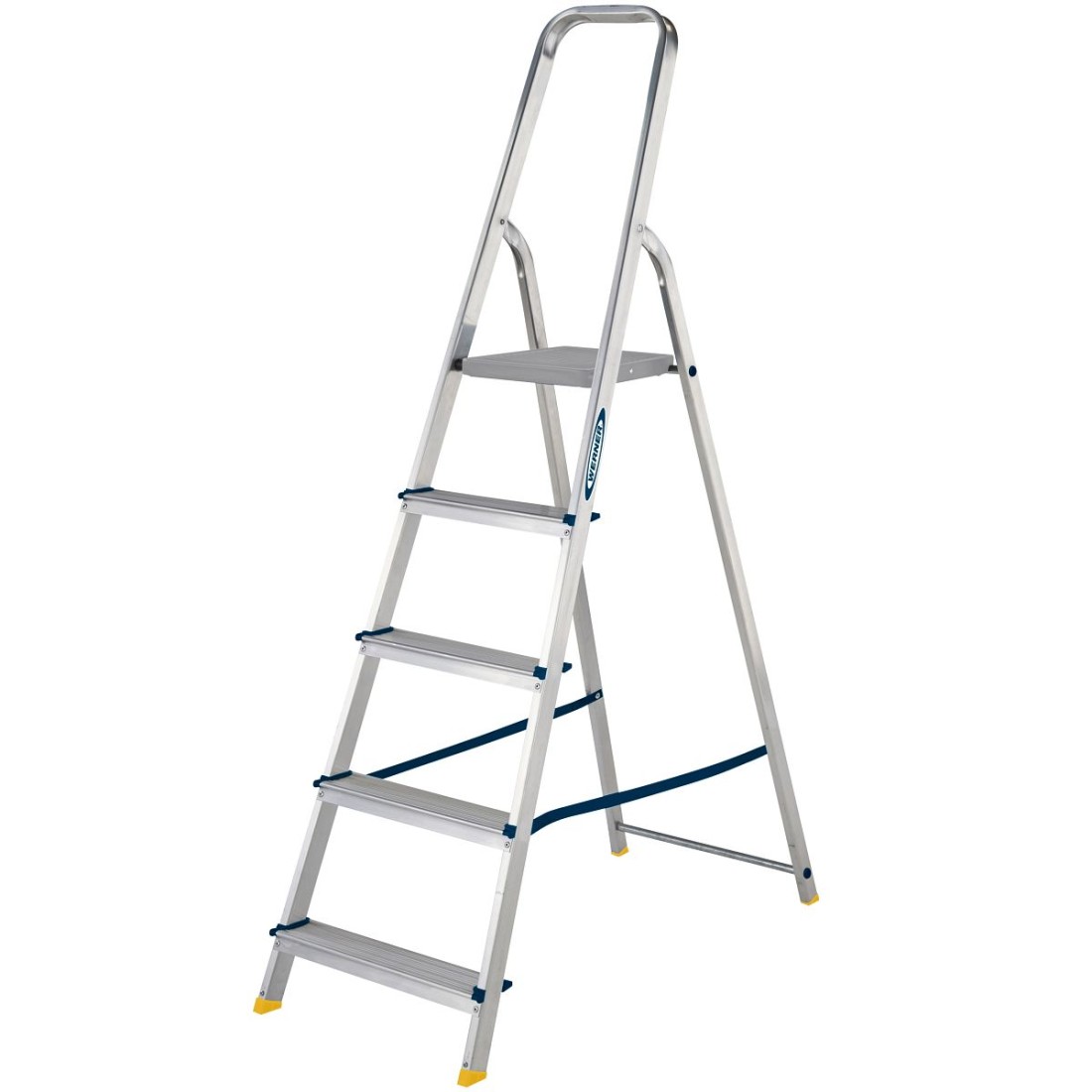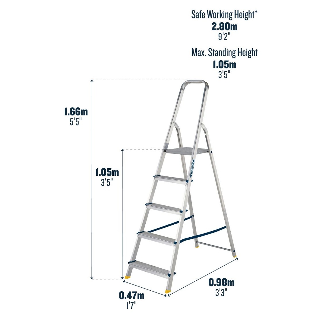 Designed to provide maximum comfort for the user, the Werner 5 tread aluminium stepladder features a large platform that provides a secure and comfortable work area and a high handrail for added stability whilst using the ladder. A platform height of 1.05m enables a safe working height of 2.80m* so this ladder is ideal for every day jobs around the worksite. Approved to the latest EN131 standard. For Professional Use.